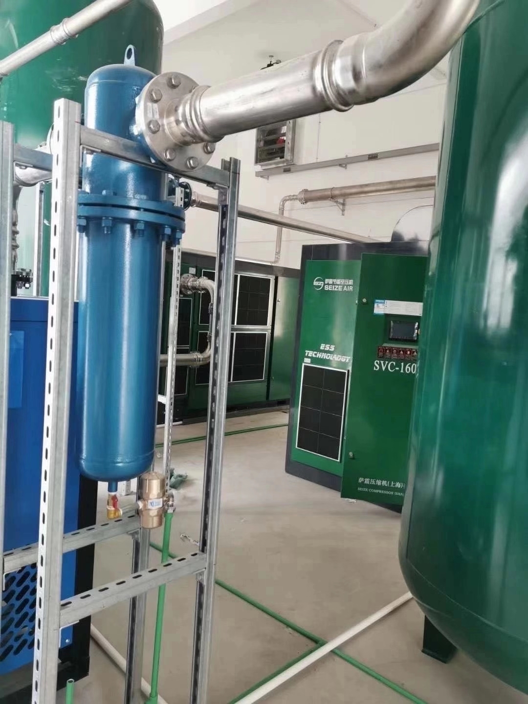 3、機(jī)房所在場地應(yīng)保持干燥,通風(fēng)條件良好,空氣清新,盡量避免多粉塵、多油、潮濕的環(huán)境,以減少對(duì)空壓機(jī)的損傷,從而延長其使用壽命,更不能使空壓機(jī)吸入有腐蝕性氣體、油漆分子和含有易爆或化學(xué)成分不穩(wěn)定的或蒸汽等氣體,以免危及空氣壓縮機(jī)使用人員或造成機(jī)組快速損壞。如工廠環(huán)境較差,灰塵多,須在空壓機(jī)吸氣口前加裝前置過濾設(shè)備。