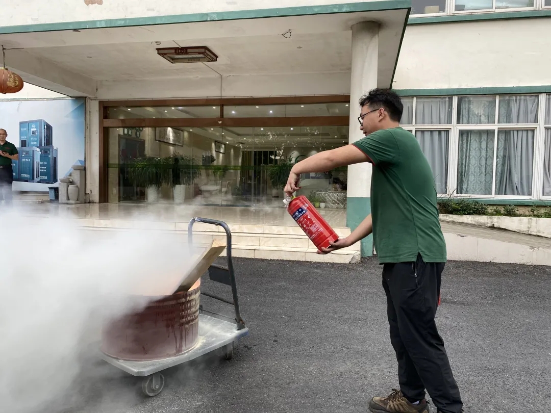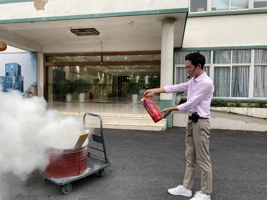 薩震節能空壓機余滔介紹了火災應急知識及正確的逃生方法,并對滅火器的正確使用,找準最佳滅火點進行了詳細的講解與現場的規范操作。